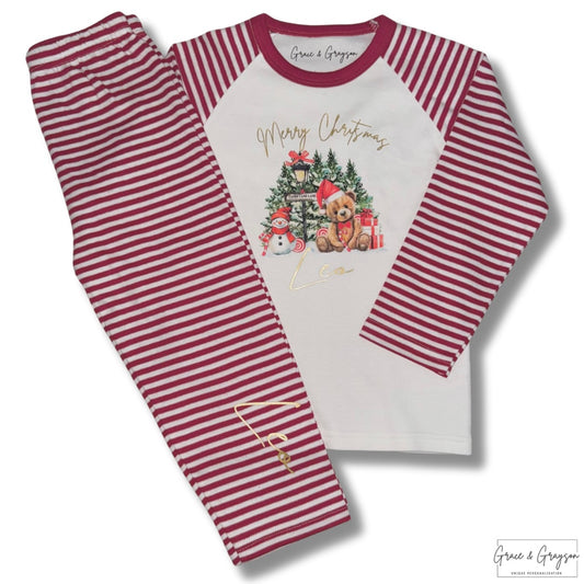 Personalised Candy Cane Lane Bear Red Stripe Christmas Pyjamas