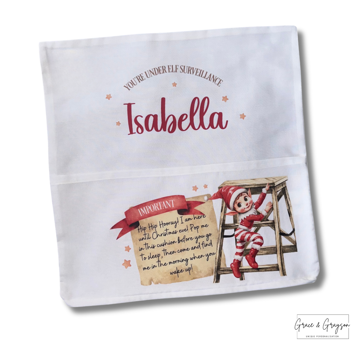 Get ready for the return of the famous elf this Christmas with our personalised Elf surveillance pocket cushion cover. Get your little ones to pop the elf inside the pocket each night.