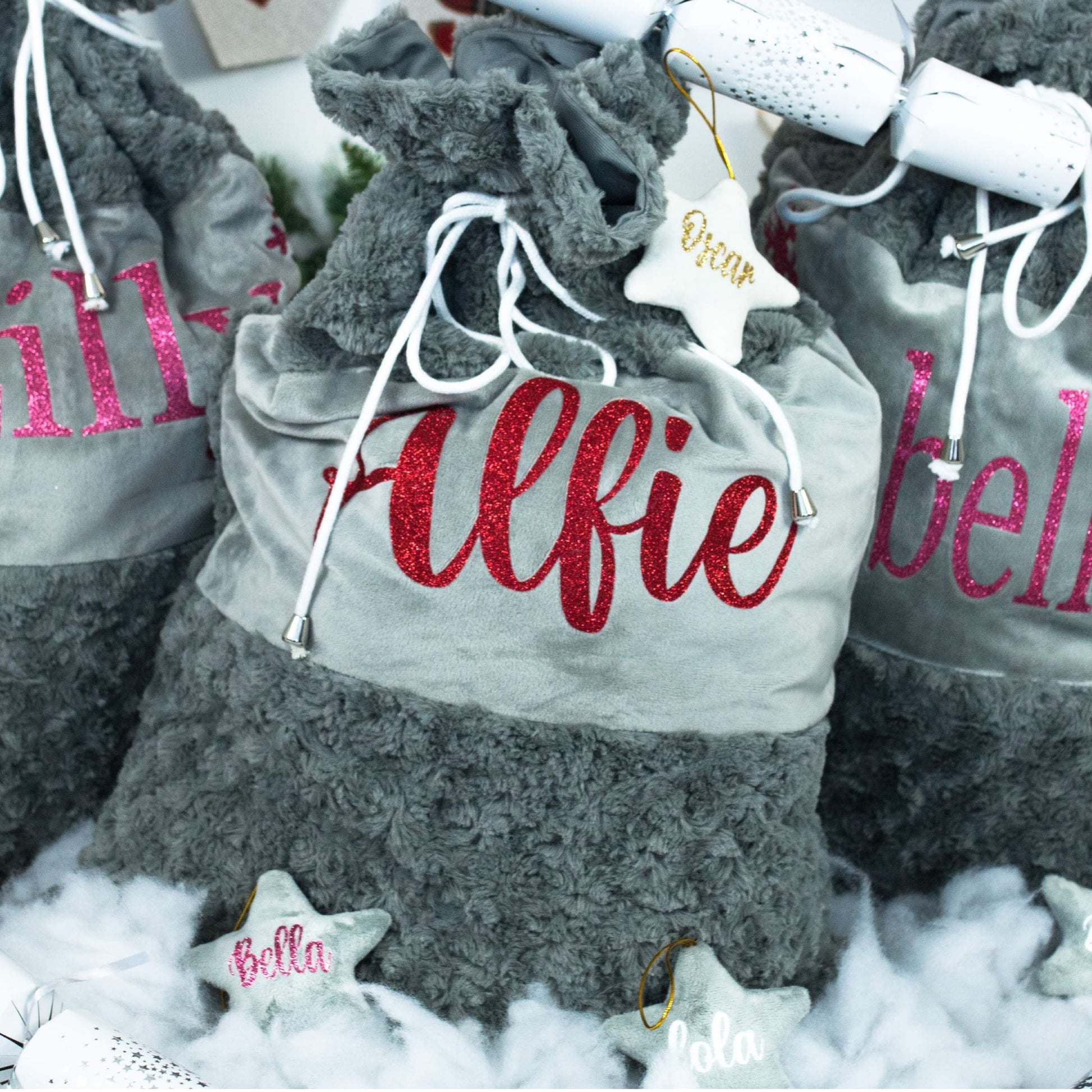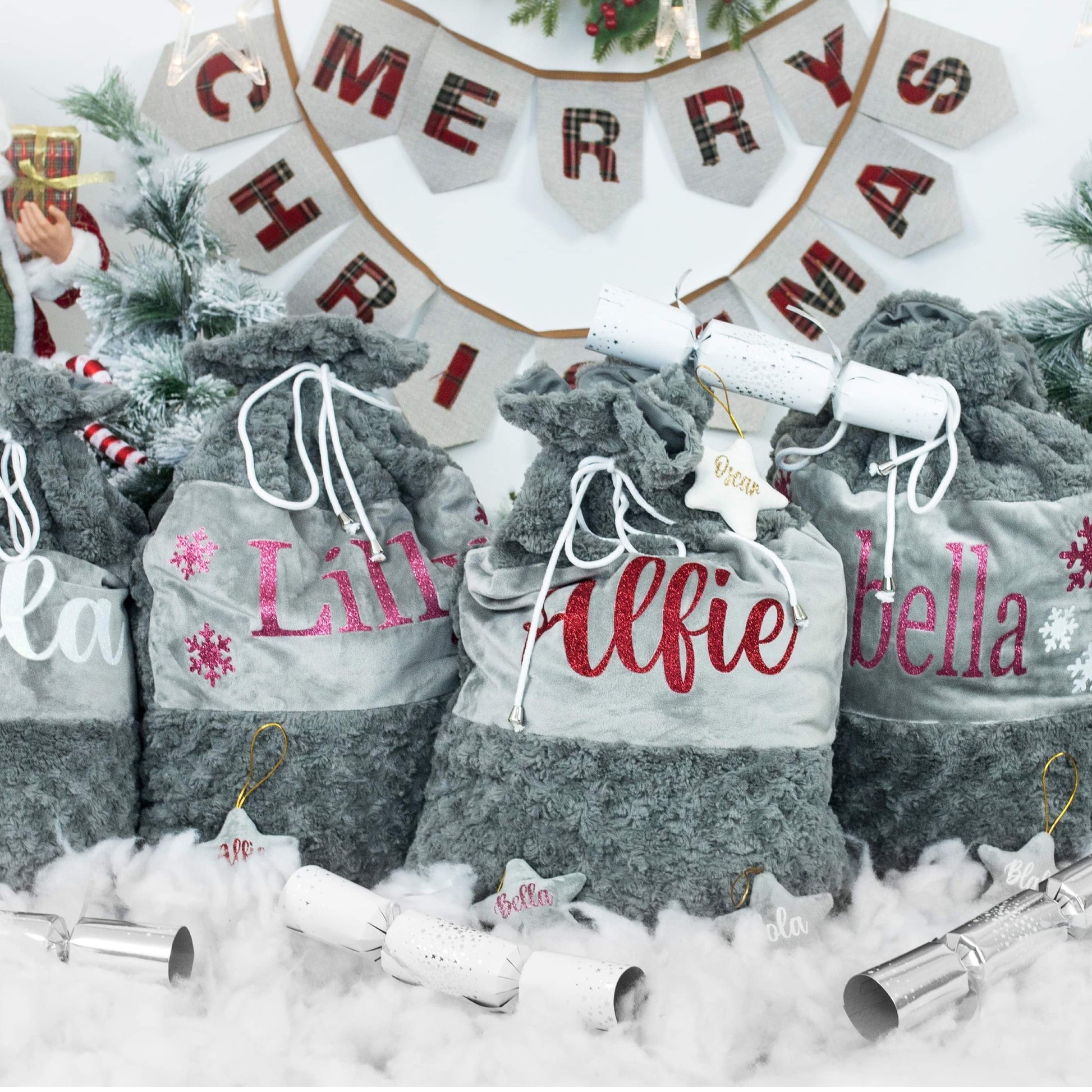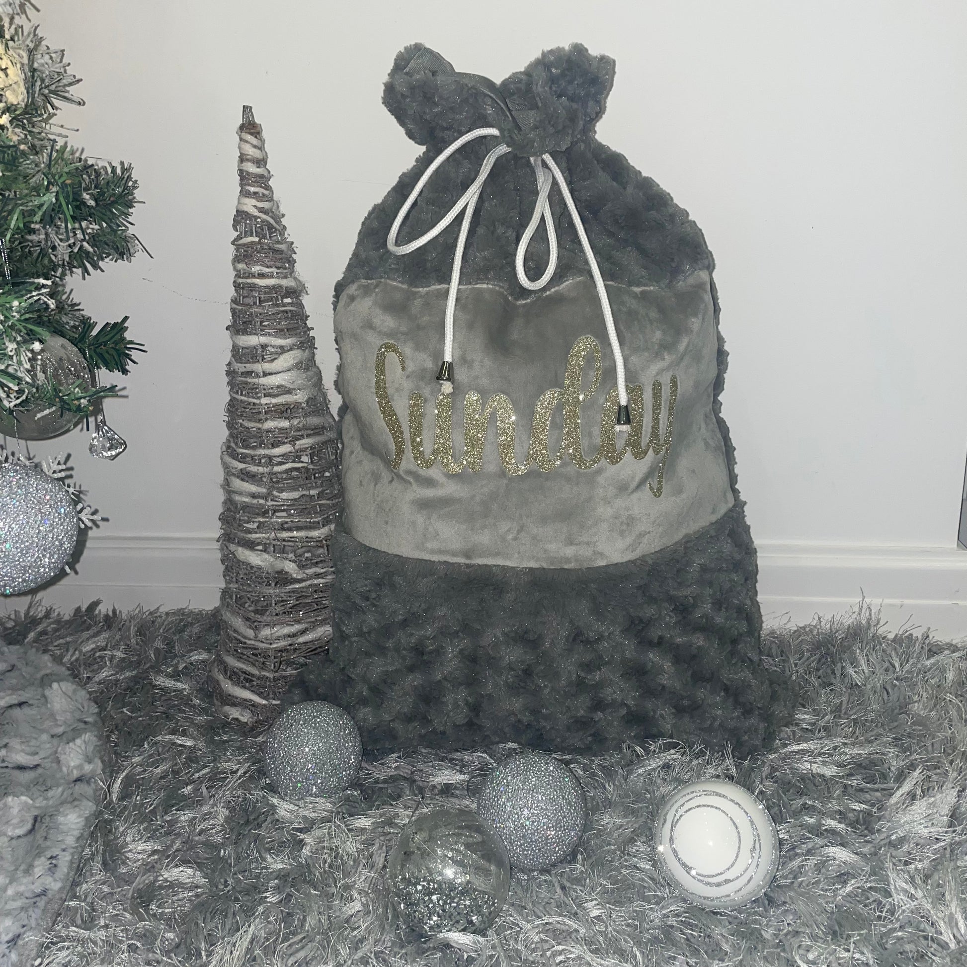 These personalised grey plush Christmas Santa sacks add an extra layer of elegance to your festive season. Personalise this soft plush sack with any text or name and choose from a multitude of fonts and colours. These sacks are robust and reusable.