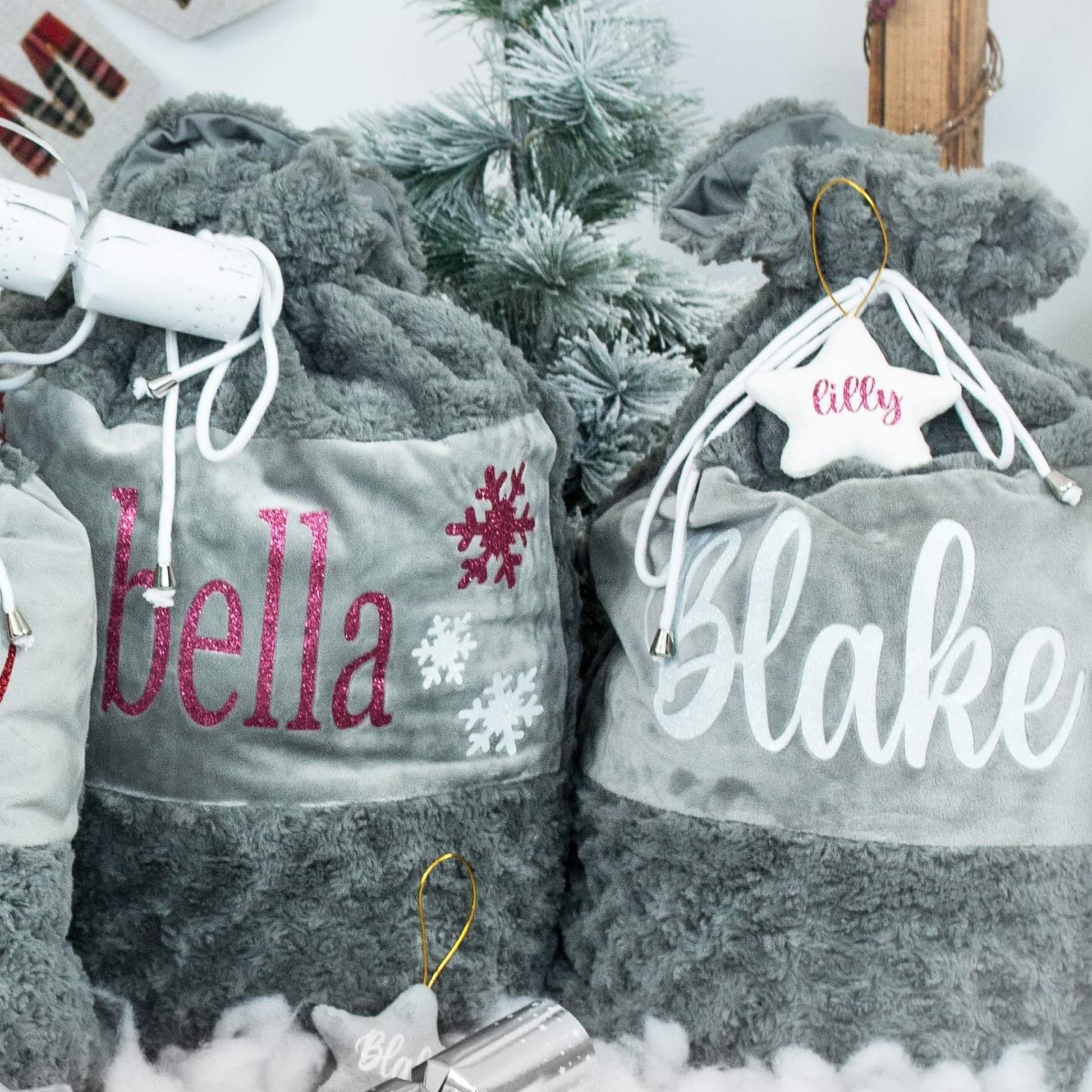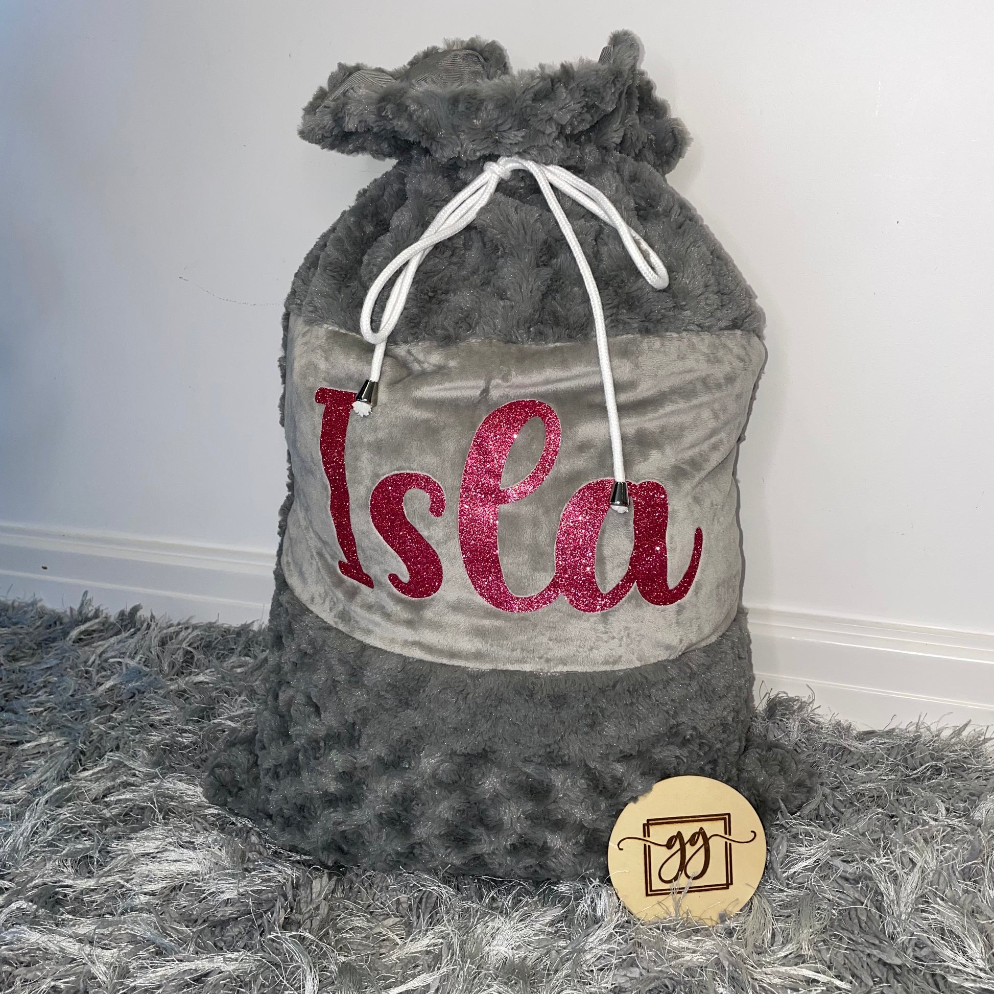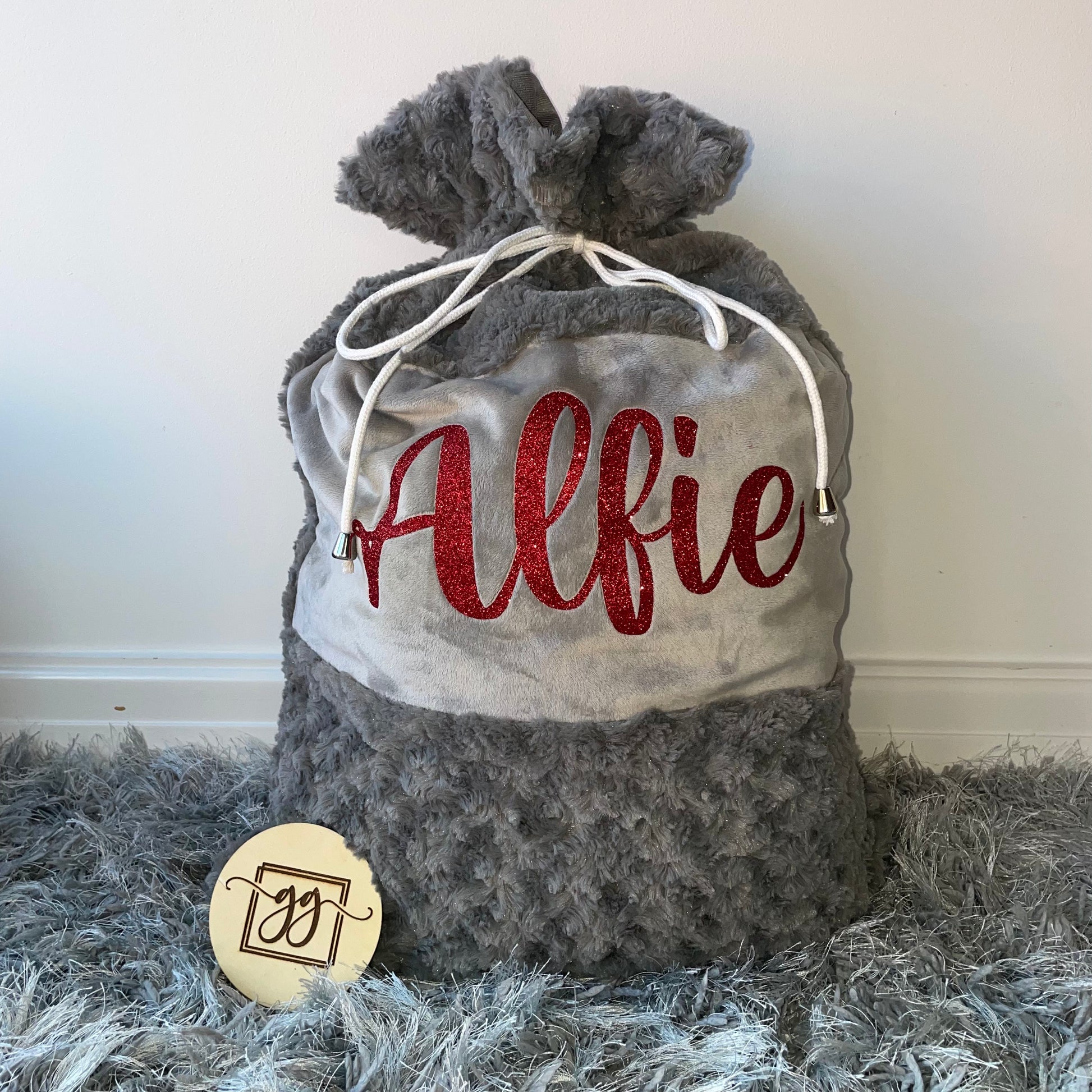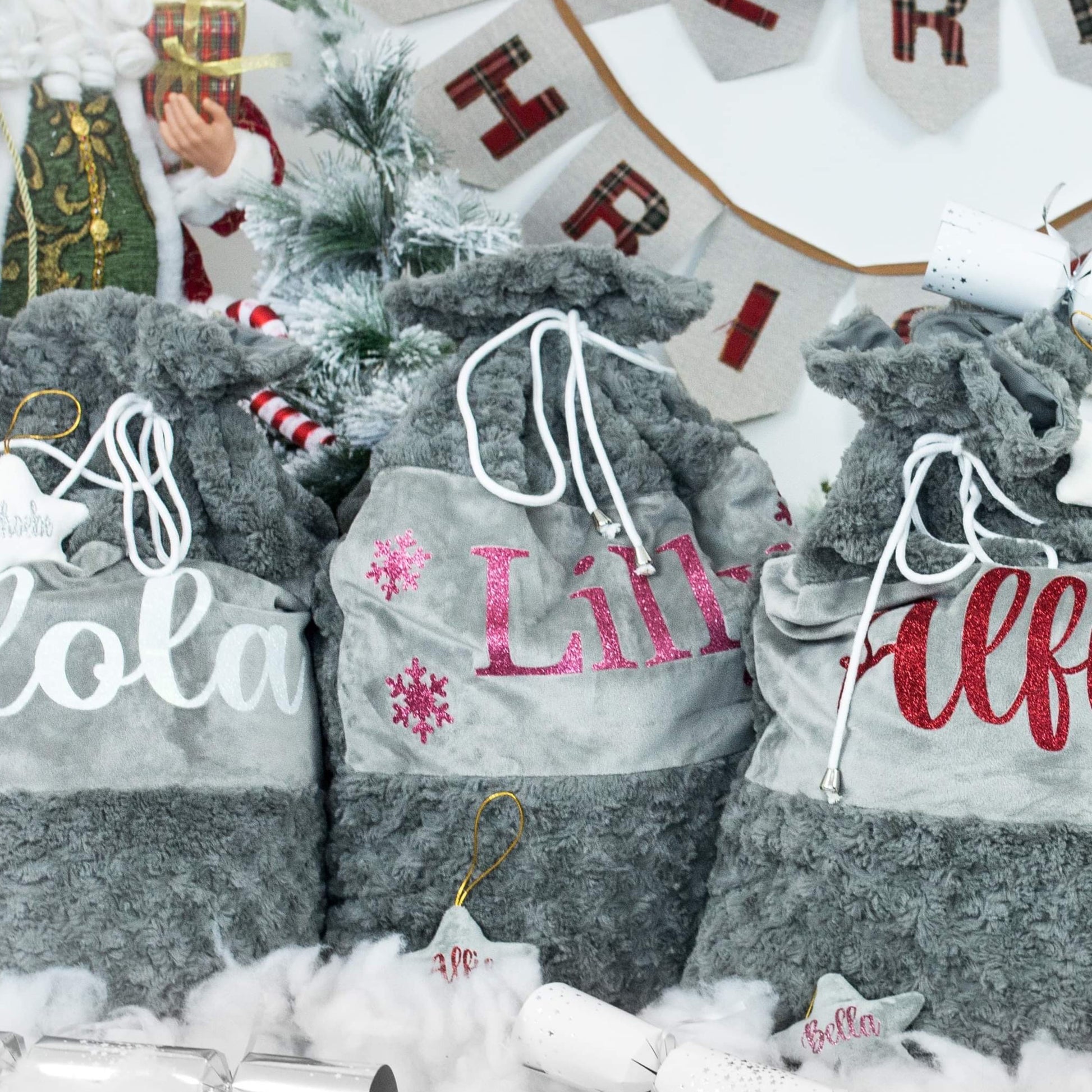 These personalised grey plush Christmas Santa sacks add an extra layer of elegance to your festive season. Personalise this soft plush sack with any text or name and choose from a multitude of fonts and colours. These sacks are robust and reusable.