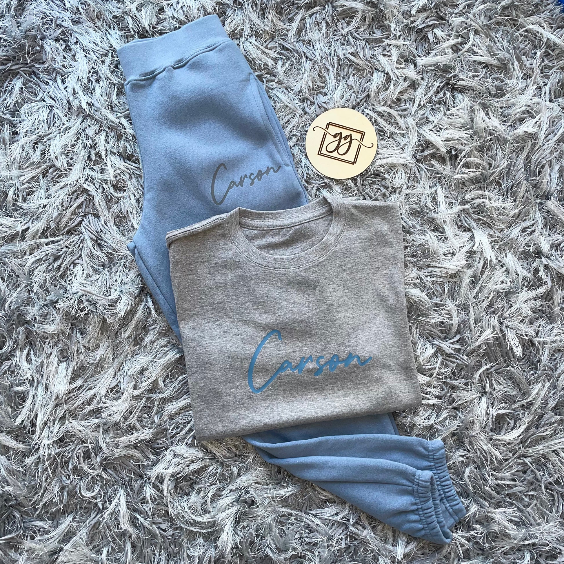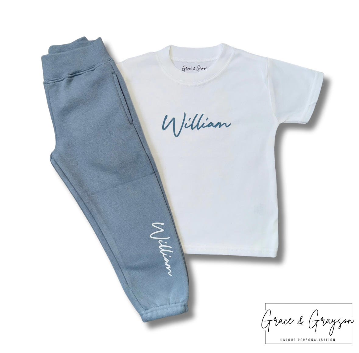 These personalised dusty blue joggers & white t-shirt sets are our new colour way range. Keep your kids looking super stylish in these soft & comfy sets.